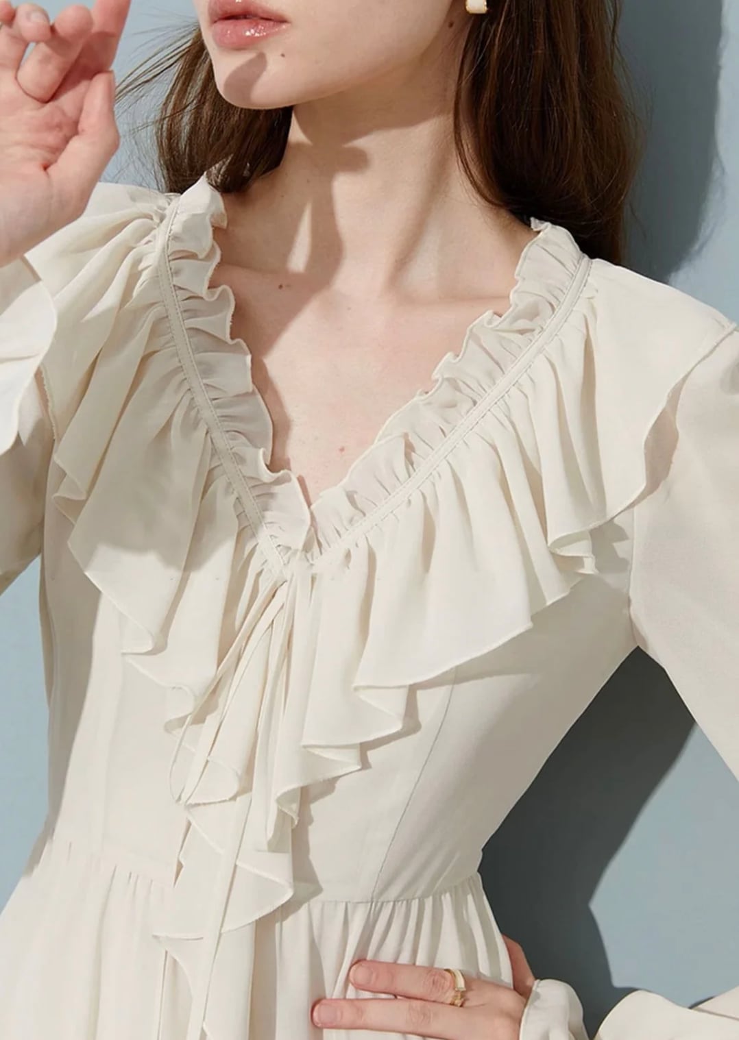 Vネックラインに施されたフリルデザインが顔まわりを華やかに見せ、デコルテを美しく引き立てるポイントに。