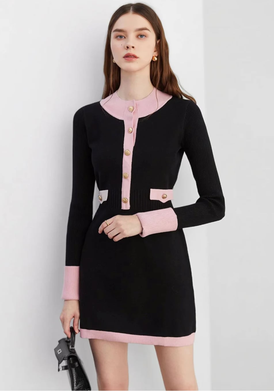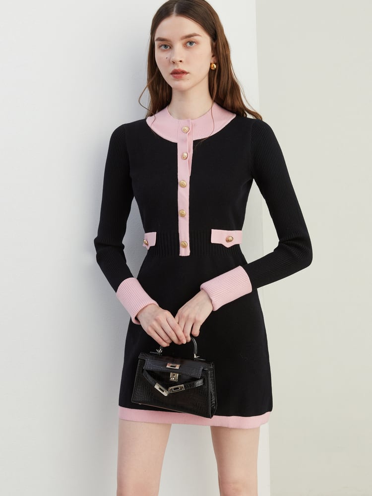 バイカラーのコントラストとキラッと光るゴールド釦がポイントのニットワンピース。