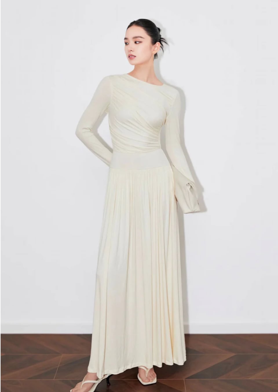 身体になめらかにフィットするとろみのある生地感大人の魅力を加速するロングドレス。