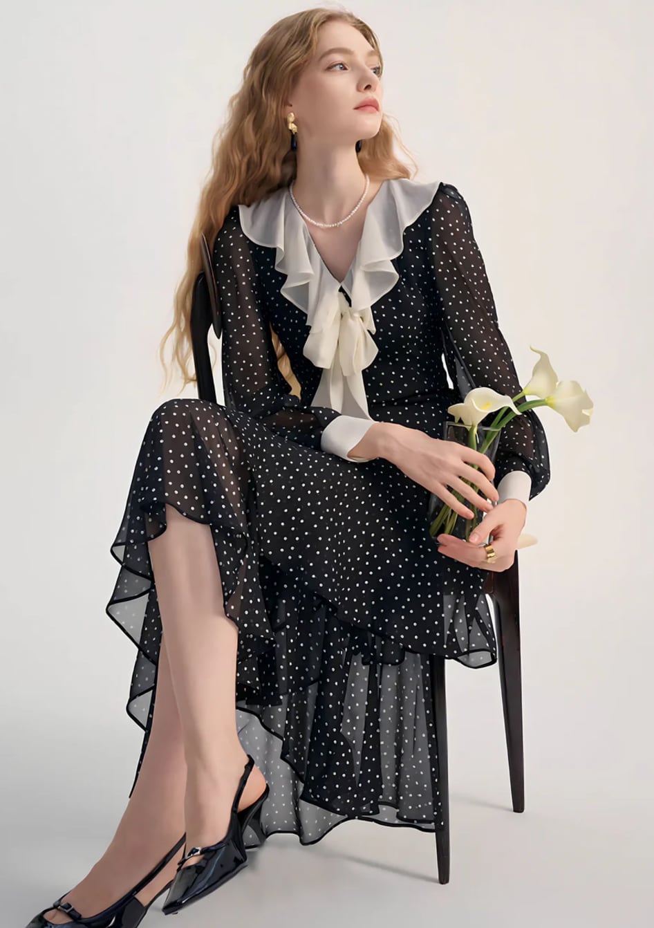 甘くなりがちなドット柄もすっきりとしたマーメイドシルエットにすることで甘すぎない大人レディな仕上がりに。