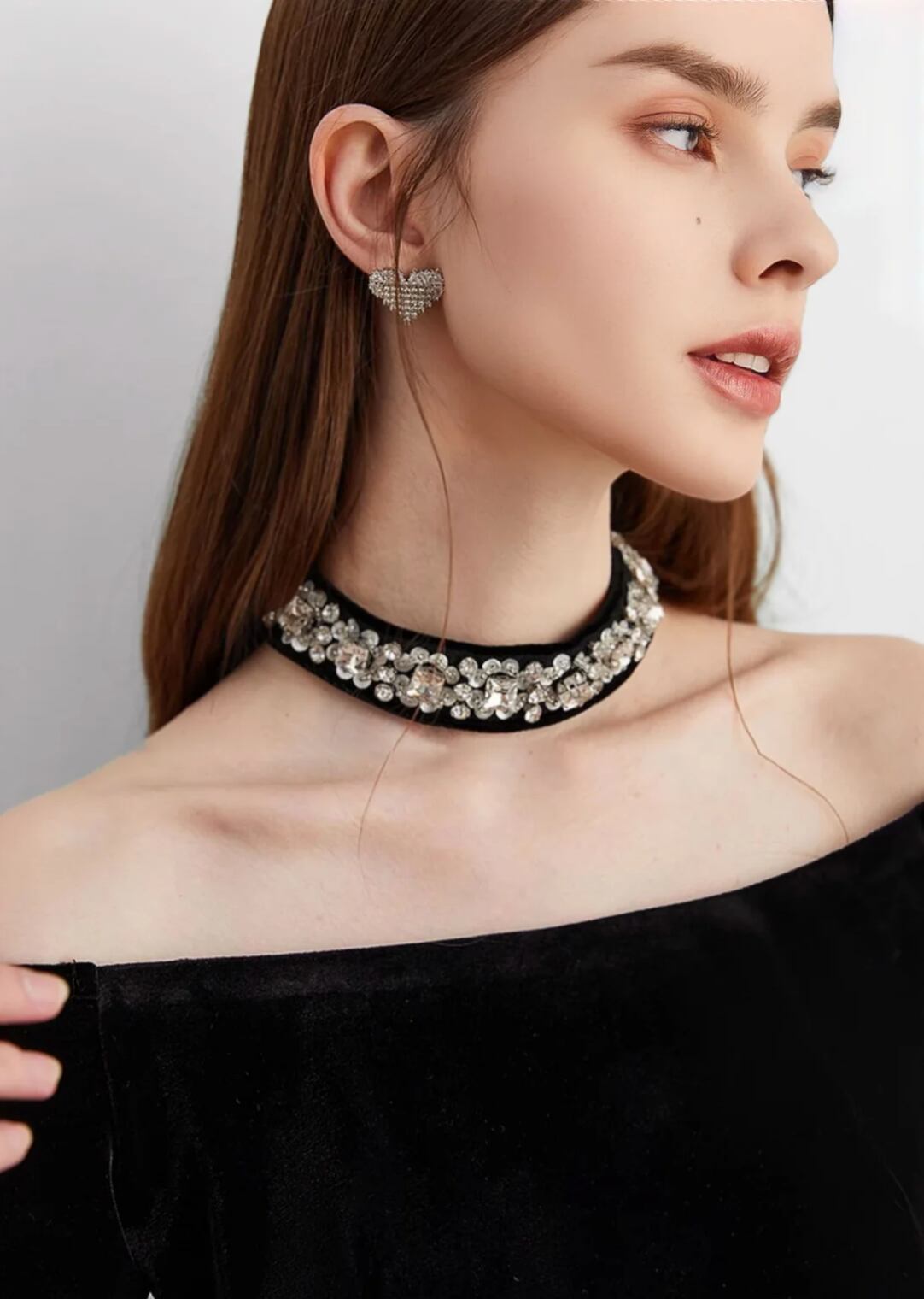 チョーカー部分には贅沢にビジューをたっぷりあしらいラグジュアリーな雰囲気に。
